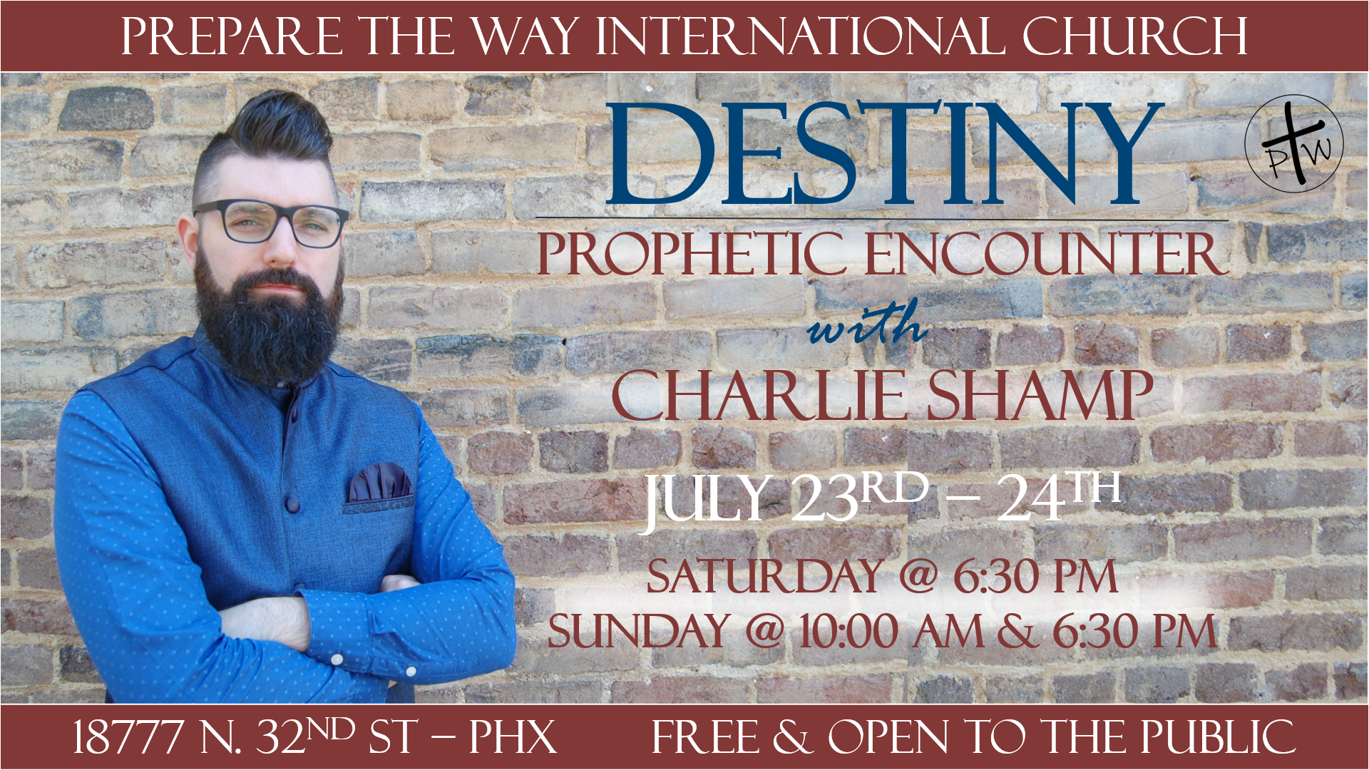 Prepare the Way International Church with Pastors Rob Winters is hosting Destiny Prophetic Encounter with Prophet Charlie Shamp.